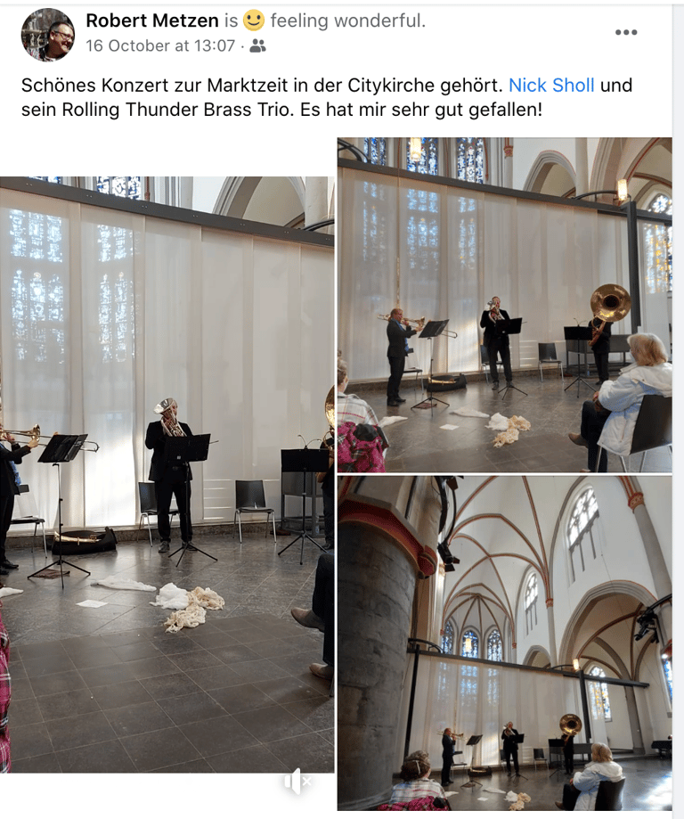 "Lieber Nick, euer gestriges Konzert als Bläsertrio in der Citykirche habe ich als Wohltat für Körper und Seele empfunden. Zu Beginn Name ich wieder einmal wie schon des Öfteren zuvor meine Herzschläge deutlich fühlbar und als unangenehm war. Üblicherweise hält der beunruhigende Zustand dann noch eine ganze Weile an - kein gutes Begleitgefühl für ein Konzertbesuch!